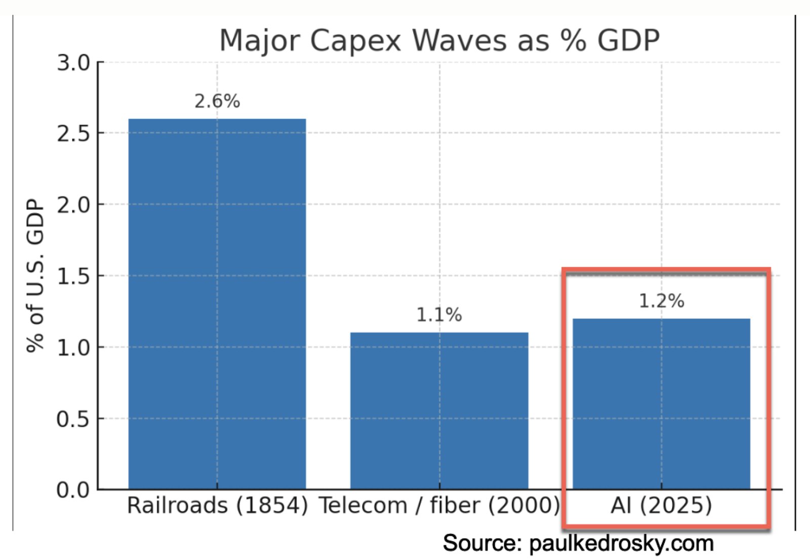 Im Moment ist davon oberflächlich noch nichts zu sehen. Im Gegenteil – die aktuellen Investitionen tragen wesentlich dazu bei, dass sich die Wirtschaft (trotz widriger Umstände durch die US-Administration und diverse Kriege) so gut hält. Die AI-Investitionen machen inzwischen mehr vom BIP aus als der private Konsum! (vgl. hier)