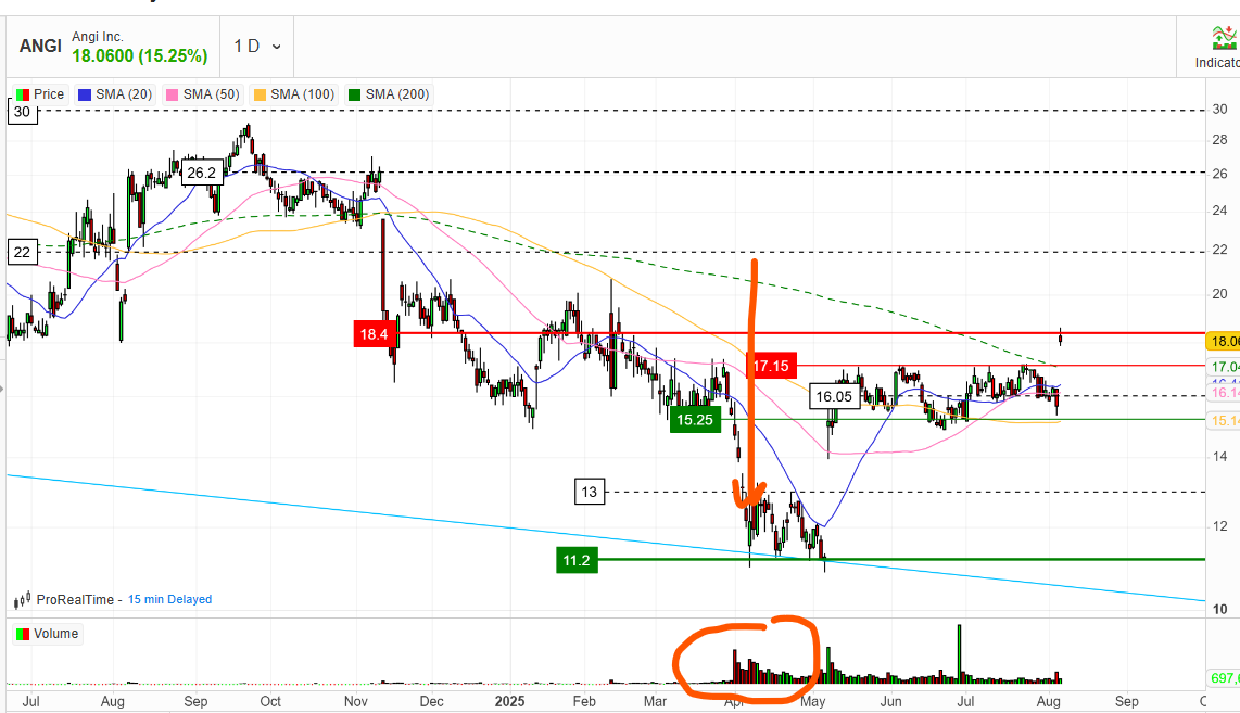 Der Mehrheitsaktionär der Gesellschaft (IAC) hat im April alle Aktien an die IAC-Aktionäre - quasi als Dividende - ausgekehrt. Solche Situationen sind immer interessant, weil mit dieser Auskehrung viele IAC-Investoren Aktionäre von Angi wurden, die das eigentlich gar nie geplant hatten. Oder auch solche (z.B. Fonds), bei denen Angi gar nicht ins Anlagestrategie passt. In solchen Situationen kommt es regelmäßig zu deutlichen temporären Aktienkursrückgängen, weil es einfach viele Verkäufer gibt - und wenige die das Unternehmen kennen, weil es bisher mit dem kleinen Minderheitenanteil ein Schattendasein an der Börse geführt hat.