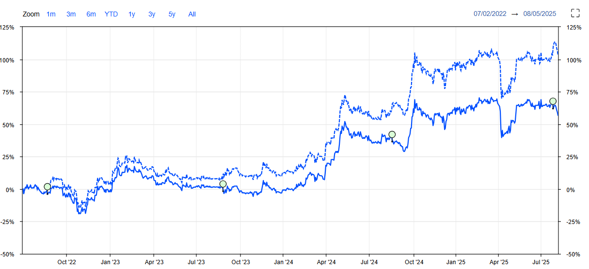 Haier hat die Zahlen für das erste Halbjahr noch nicht veröffentlicht, aber alle Anzeichen deuten darauf hin, dass das Unternehmen die Unwägbarkeiten aus den Zollproblemen, den Spannungen zwischen den USA und China und den Binnenmarktproblemen in China sehr gut meistert. Um die Performance der Aktie zu beurteilen ist es wichtig, die Dividende mit einzubeziehen - diese wurde in Höhe von 11,84 Euro-Cents gerade im Juli für 2024 bezahlt - das entspricht alleine einer Rendite von fast 7% auf den derzeitigen Kurs.