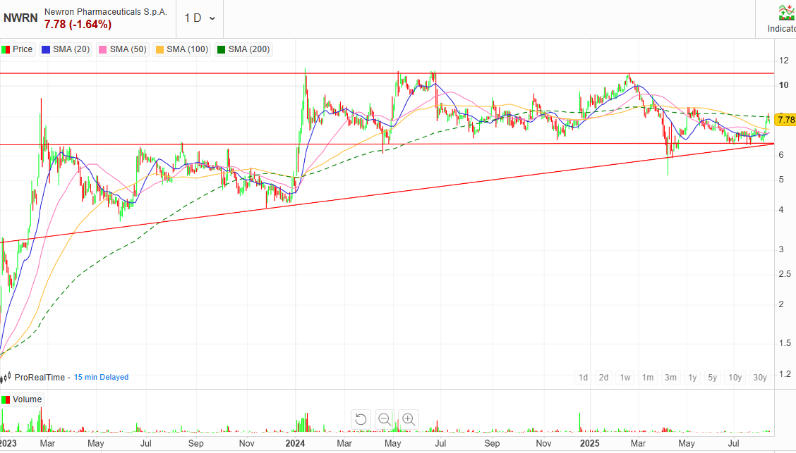 Der Kurs von Newron bewegt sich seit über einem Jahr in einer Seitwärtsrange, mit einem kurzfristigen Abtauchen unter die 6-CHF-Marke Ende April 2025. Betrachtet man den Chart, könnte man meinen, dass sich in der Unternehmensentwicklung seit über zwei Jahren nicht viel getan hat – Anfang 2023 notierte Newron schließlich auch schon kurzfristig bei über 8 CHF. Das ist jedoch nicht …