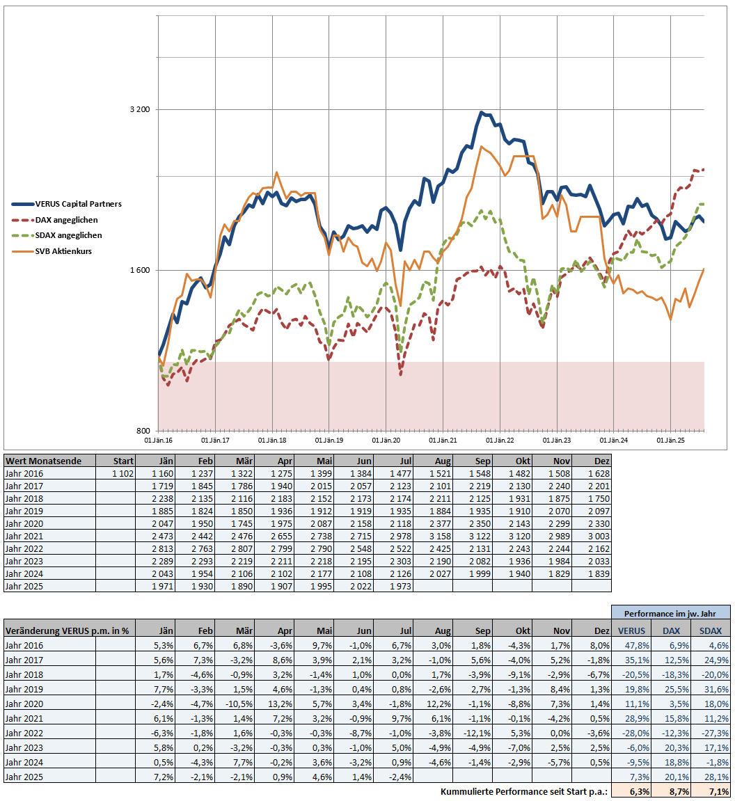 Wie bereits berichtet, wurde die Gesellschaft organisatorisch und betreffend den Investment-Prozess seit Anfang 2025 neu aufgestellt. In der neuen Ausrichtung wird das Vermögen nicht mehr durch einen externen Asset-Manager verwaltet, sondern die Gesellschaft hat ein eigenes Investment-Team aufgebaut. In diesem Zusammenhang hat sich seit Juni auch meine persönliche Rolle nochmals verändert. Ich bin aus dem Aufsichtsrat ausgeschieden und habe ein Vorstandsmandat bei der SVB AG angenommen. In dieser Funktion arbeite ich mit dem Team operativ daran, dass wir für die SVB in der Zukunft einen attraktiven Return für die Investoren erwirtschaften können.